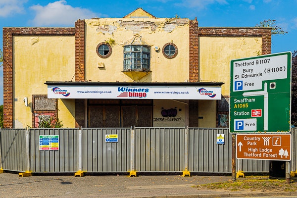 Today I restarted my road trips after last weeks initial drive around Norfolk. This trip took me down the A11 to Thetford and then I turned off towards Brandon on the A165 past USAAF Lakenheath, though not officially Norfolk but nipping in and out the borders. Brandon was interesting as I've not really stopped and walked about but I came across this amazing derelict bingo hall which is obviously about to be demolished.